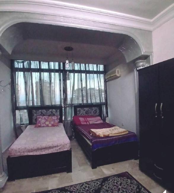 التوزيع غرفة نوم وصالون ، مساحة 80م ، طابق 8 ، الاكساء فرش جيد جدا ، مصعد طاقة شمسية ، ناطور ، الاجار سنوي